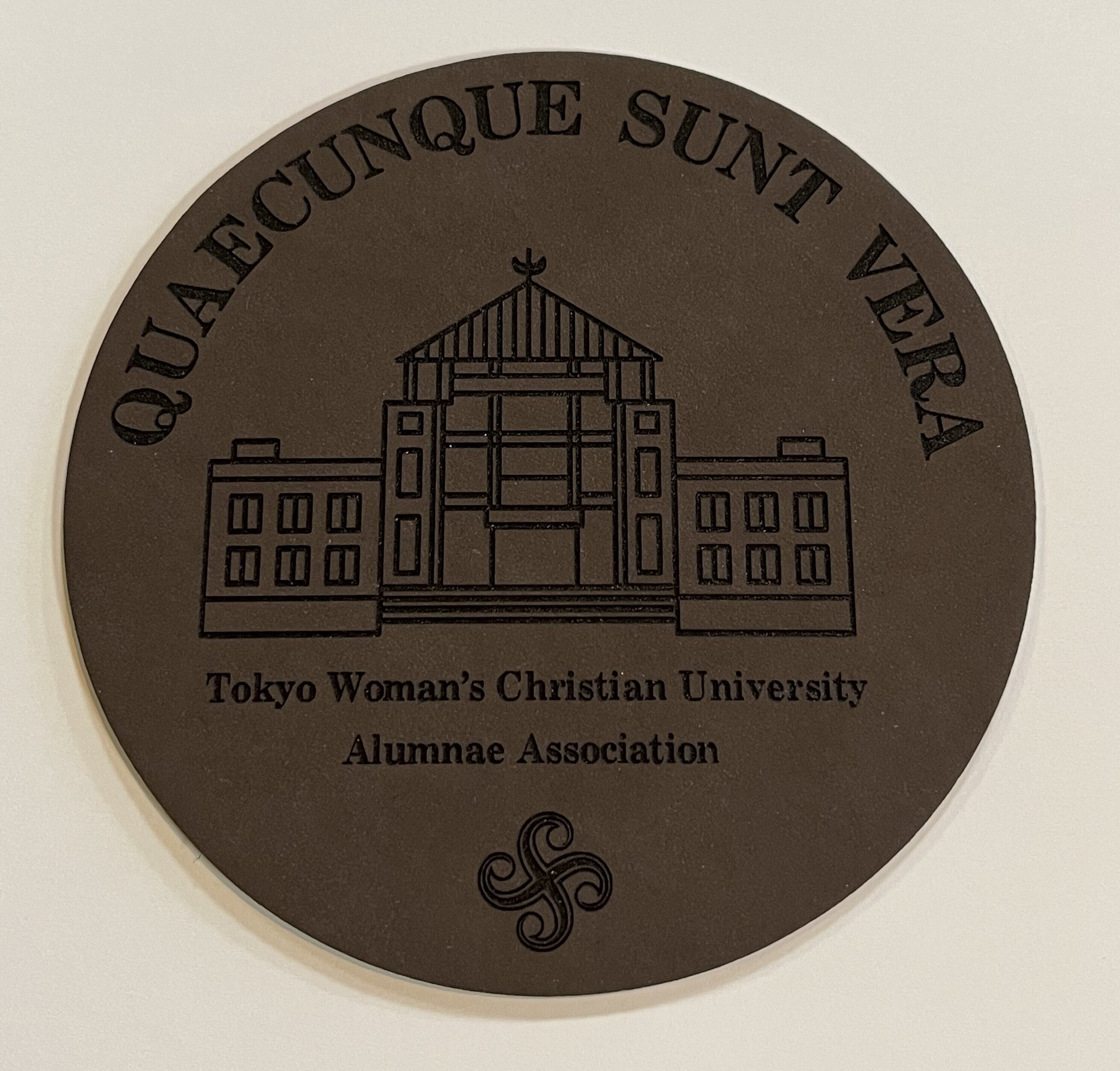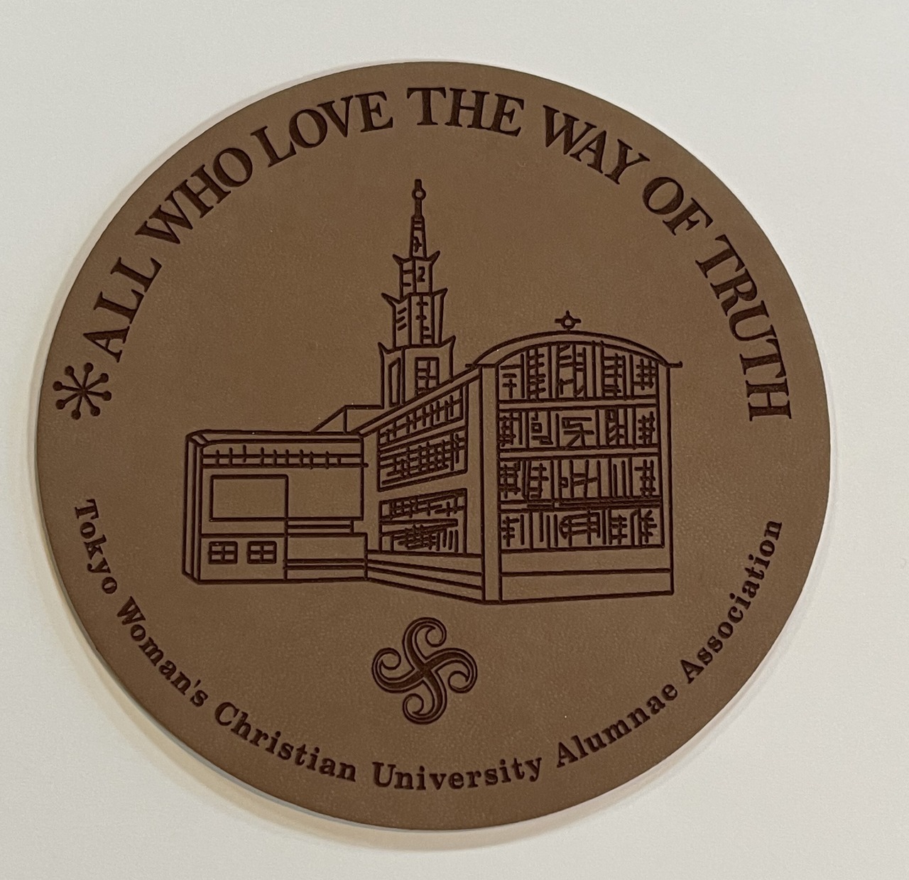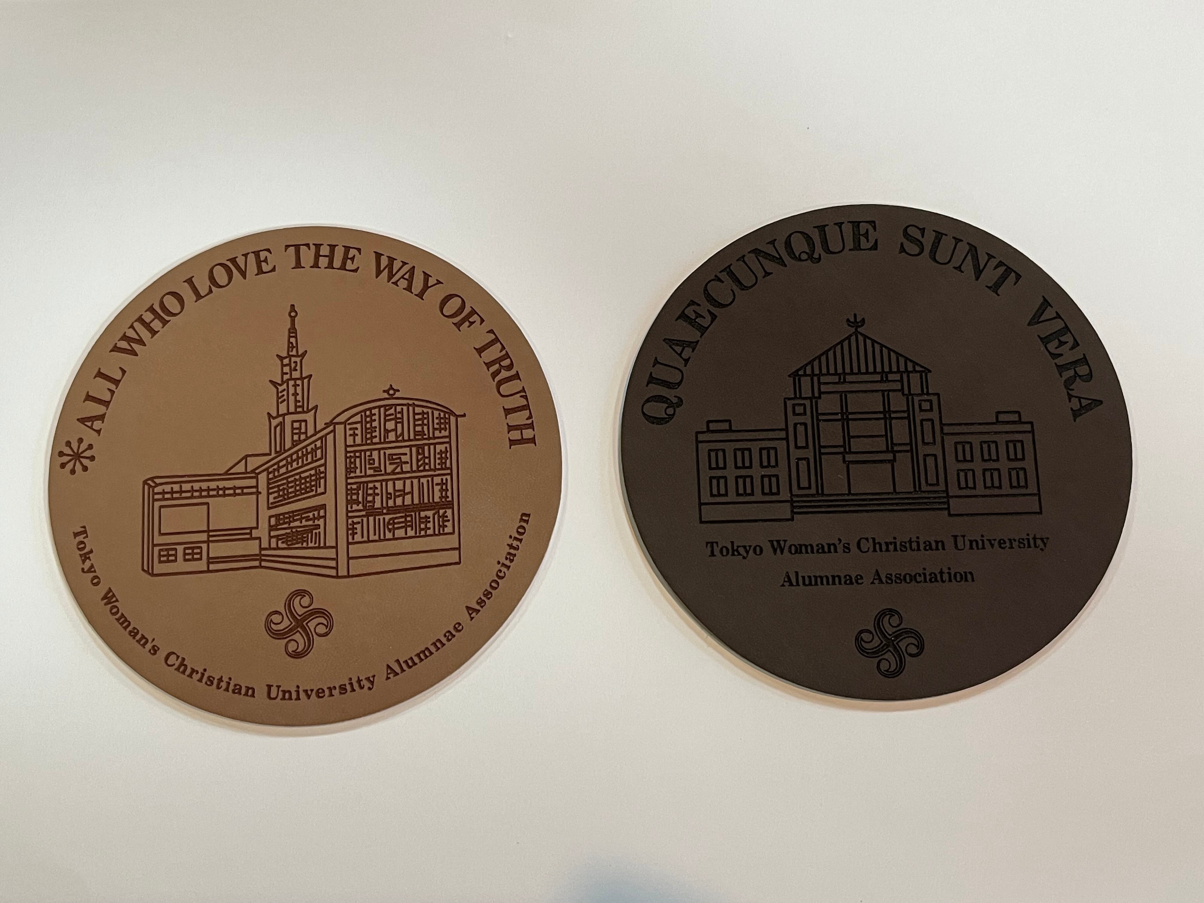 ●チャペルの絵、SSマーク、校訓が入った、合皮製のコースター。