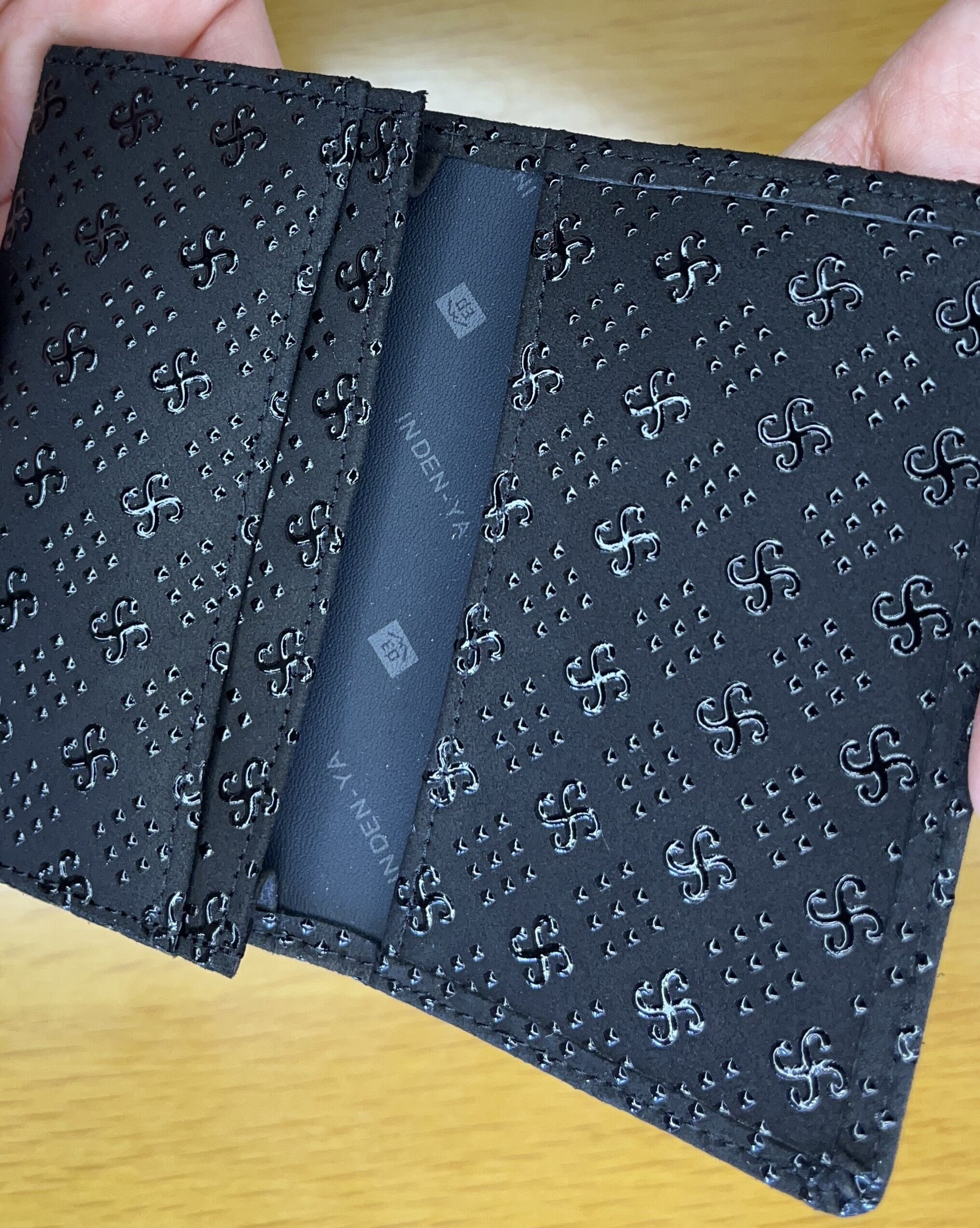 SS柄の印傳がほどこされています。軽くて丈夫です。中は2つに分かれていますので、ご自身の名刺と頂いた名刺を整理できます。